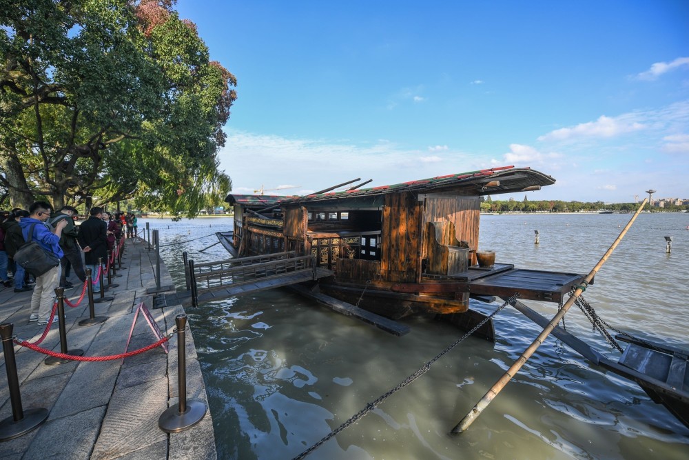 停靠在嘉兴南湖湖心岛的南湖红船。新华社发