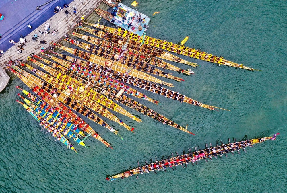 2022年7月22日,贵州省黔东南苗族侗族自治州镇远县举行龙舟文化节活动,参赛龙舟队在镇远县?阳河上集结(无人机照片)。新华社发
