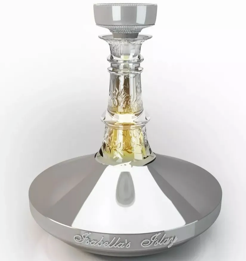 钻石款整个瓶身镶嵌了8500多颗白钻,瓶身下方用300颗红宝石排列Isabella's Islay的字样,定价620万美元;而水晶款则是以英国顶级水晶包覆在白金酒瓶的瓶颈处,再以白钻排列品名,售价虽不及钻石版,但也高达74万美元。