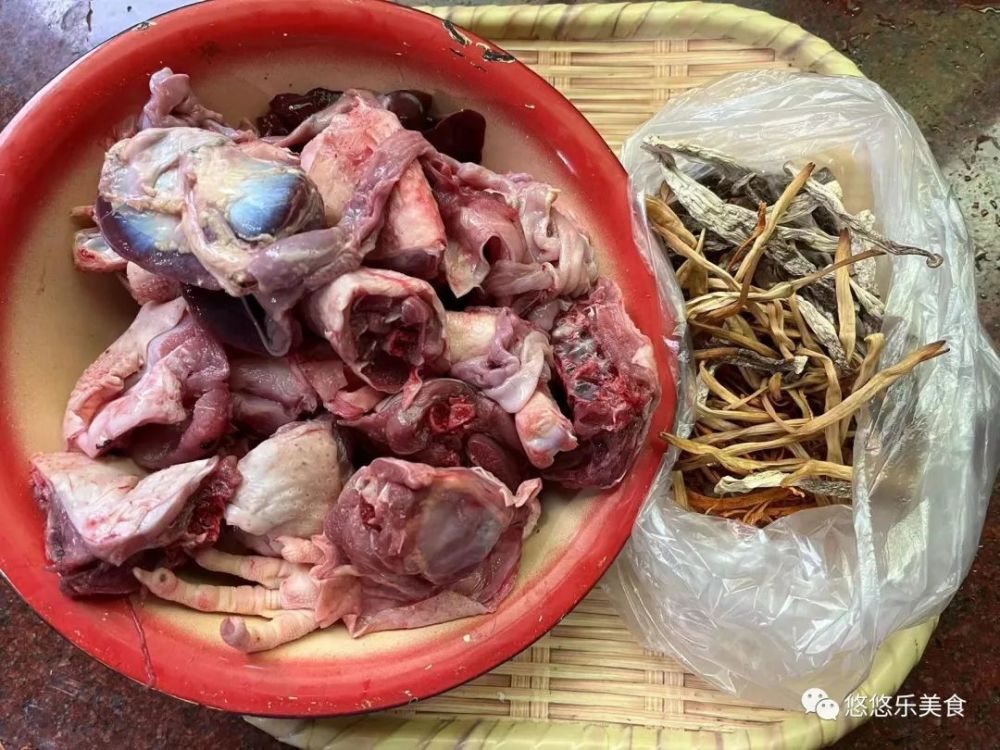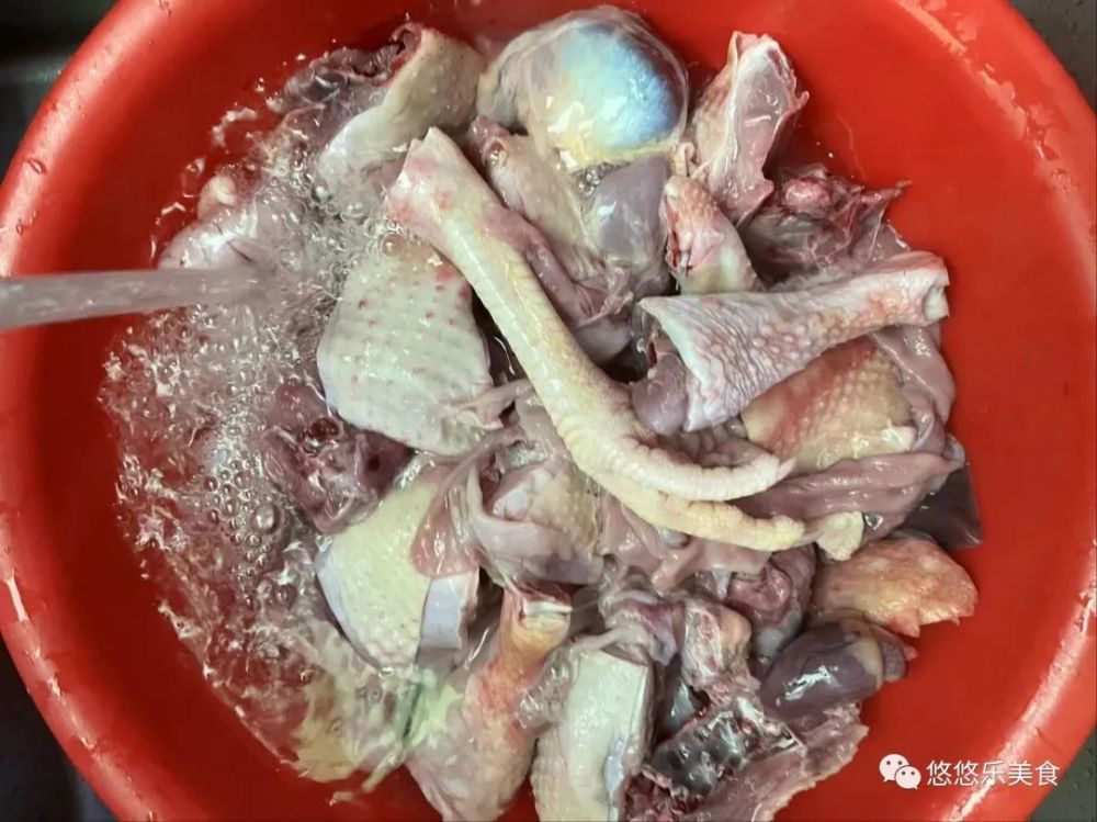 2.今天的鸡肉是老妈自己养的,然后做起来给它处理掉。处理好后我们再用清水给它洗干净,可以多冲洗几遍,更好地把它洗干净。盘中的所有食材洗净,洗净后捞出。需要做的拿出来,再放在案板上给它切成小块,切好的鸡肉放在一旁备用;