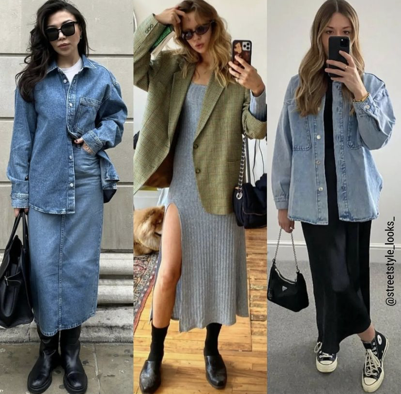 还可以用套装式的思路来搭配,比如牛仔衬衫和同款半裙,穿出休闲酷飒风。弧线型西装配薄针织长裙,是职业轻休闲风的感觉。而硬朗线条的牛仔衬衣配绸缎裙则利用不同面料碰撞出新意,搭出花式好玩的风格。