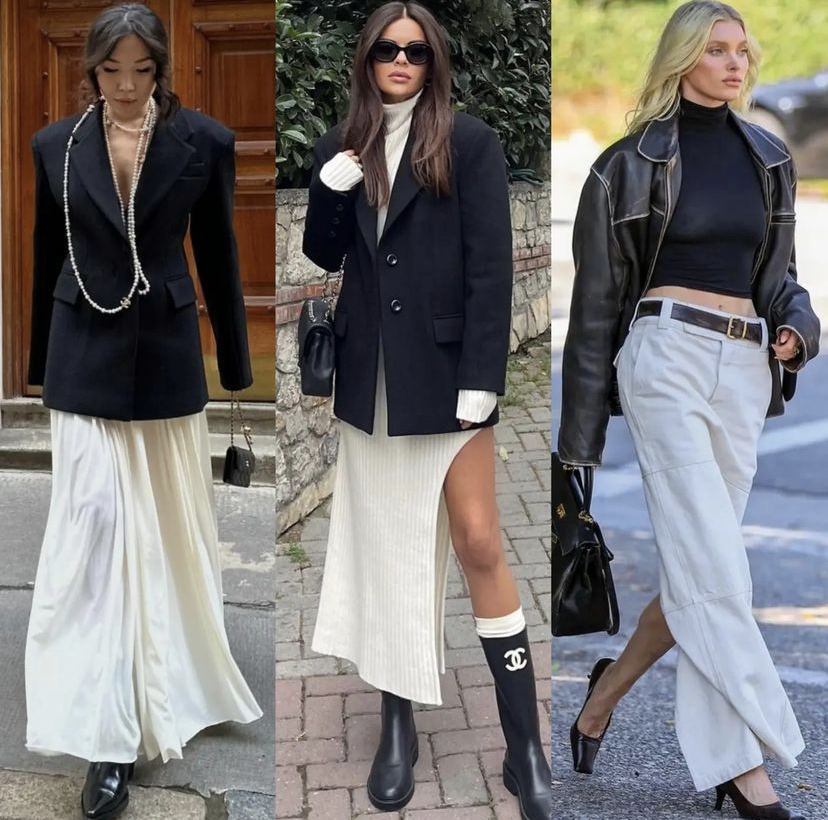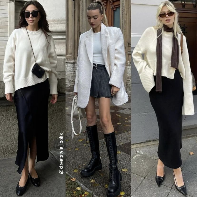 春天需要穿外套,所以半裙的搭配会比较好。想优雅地显瘦可以选长款半裙,无论是搭卫衣或毛衫都适合。如果你有漂亮腿线,就用廓形西装配短裙,用长靴利落收尾。如果全身搭配用黑白两色,更有种极简的美感,可以轻松拿捏裙子的时髦感。
