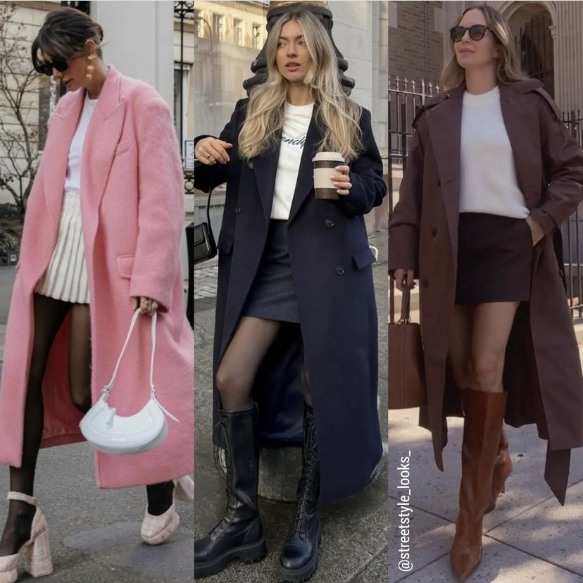 有些城市才刚刚10来度,正好可以用大衣配短裙,有长大衣撑起气场,也能巧妙地拉长整体身材线条,即使对自己身材腿型没什么自信也可以挑战一下,可以把裙子穿得很帅气哦。