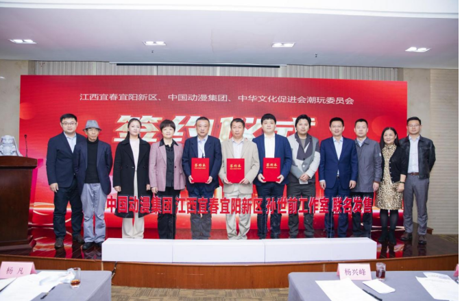 宜春市宜阳新区党工委书记李雪梅、中国动漫集团副总经理孙浩、中国文化行业娱乐协会副秘书长李颖、中国动漫集团北京中文发文化发展有限公司常务副总经理杨凡、中华文化促进会潮玩产业委员会执行主任高磊、中央美术学院孙世前等出席签约仪式。