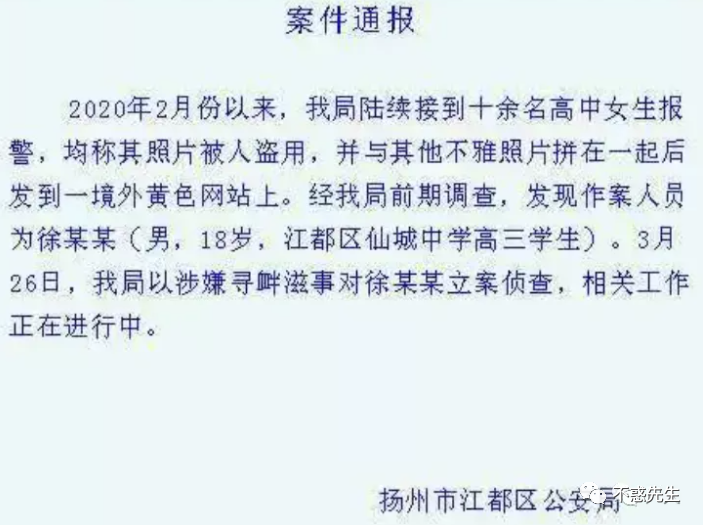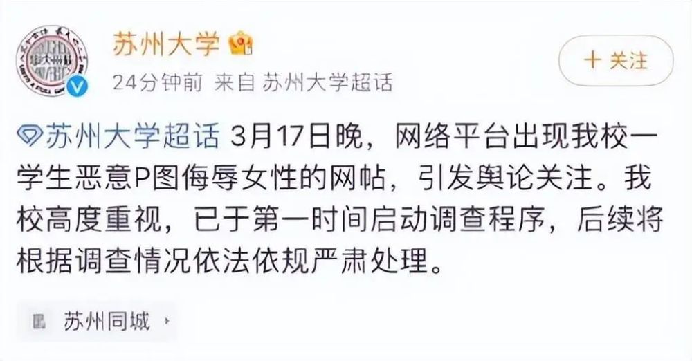 “我就是心理变态 求原谅”,3月18日,江苏苏州大学发布通报回应校内一男大学生恶意利用女同学照片,发布于黄色网站一事,称已启动调查程序,将依法依规处理。