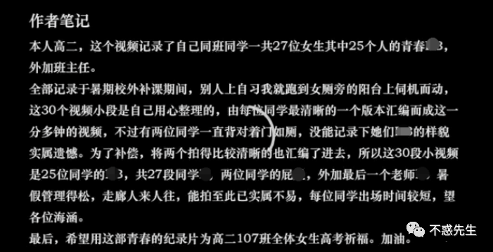 同时被曝光的还有一男的,拍摄自己女同学们的日常视频,取名为“高中大神偷拍全班27个女生上厕所并汇编成集”并上传到了网上。