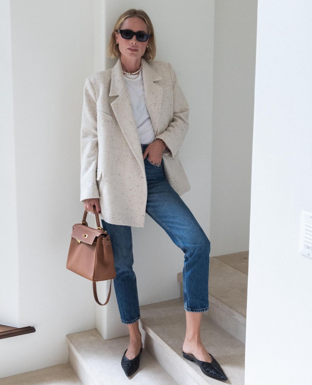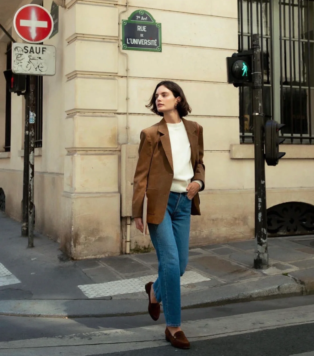 蓝色直筒牛仔裤能打造出的风格其实特别广泛,最简单的穿法就是极简风格,一件中性风的廓形白衬衫+高腰蓝色九分裤,利落大气又不失都市女性的洒脱力量,轻盈露出的脚踝与颈部的肌肤交相呼应,为帅气的穿搭注入随性慵懒的调调,轻松演绎极简风格中低调优雅的高级感。