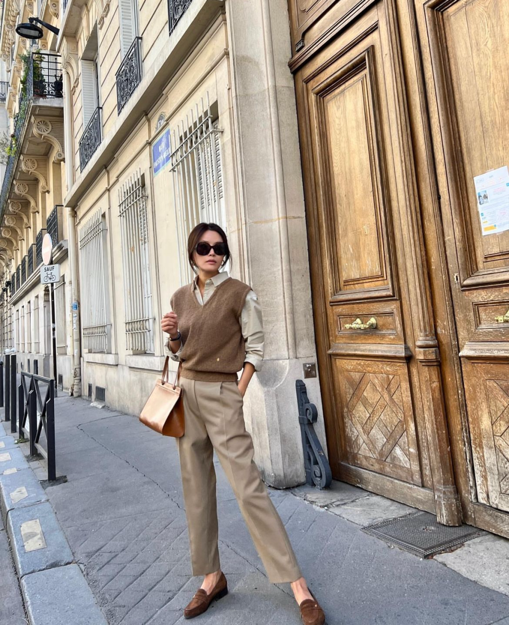 九分锥形裤最简单的搭配就是为它匹配一件衬衫,再用马甲进行叠穿,集绅士优雅与老钱风度于一身,是职场女性内心都向往成为的GentleWoman的模样▼