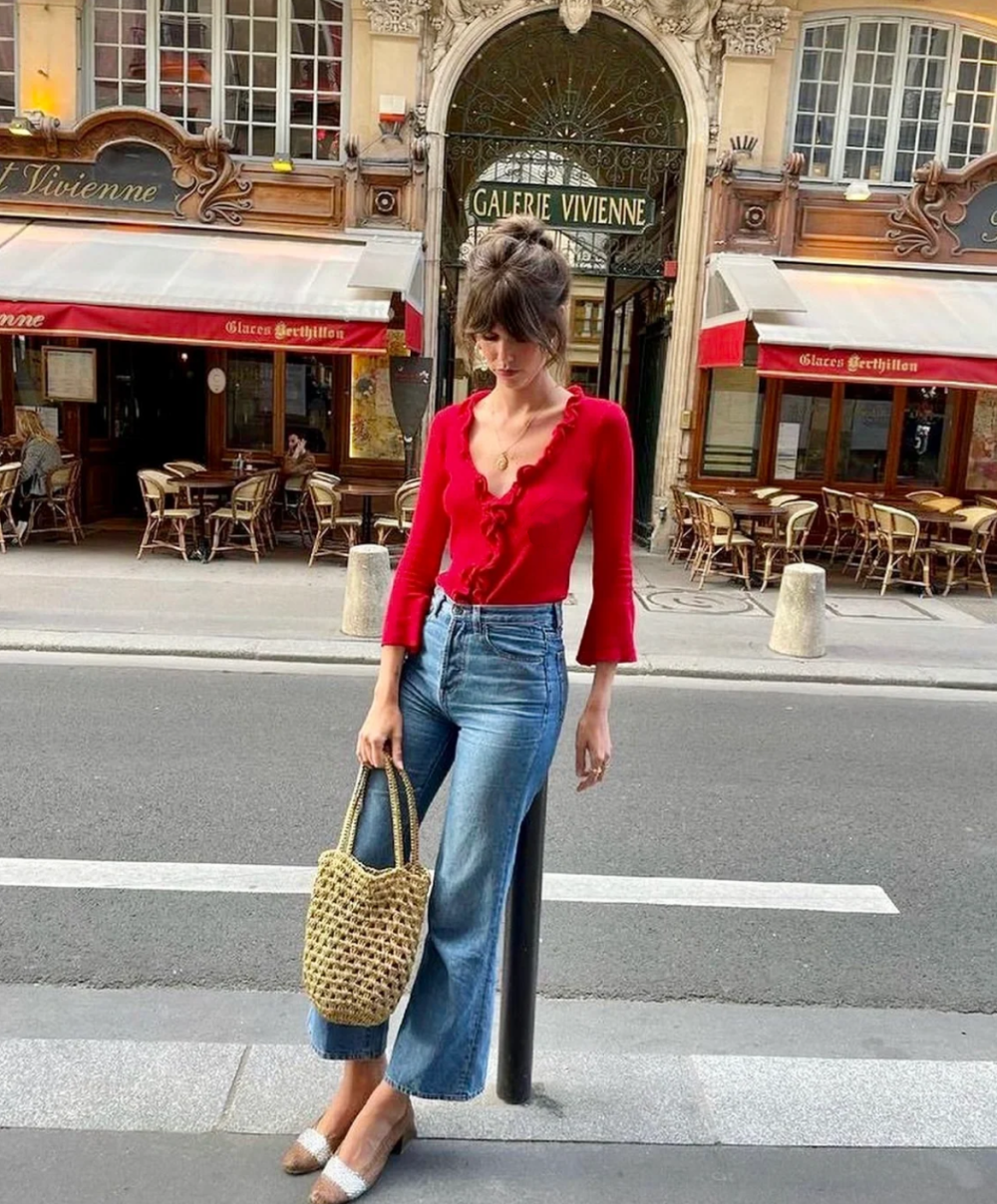 裤装与裙装最大的不同,就是裤装没有那么多的曲线感,所以它总是看起来一本正经的,没有裙装那么姿态婉转;但是微喇九分裤的出现,却很好地打破了人们对裤装产生的刻板印象。