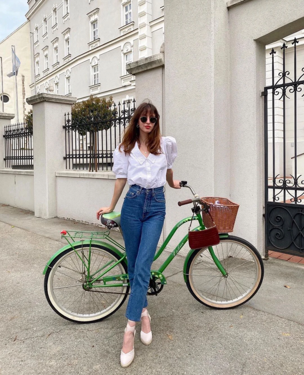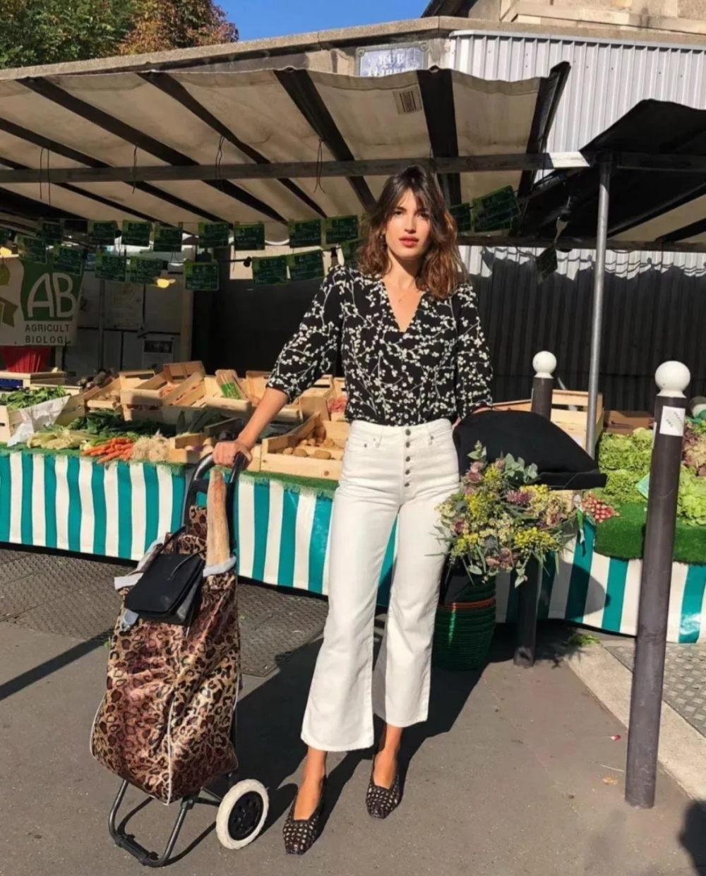 拥有着毫不费力体质的法国女人们,在春季穿搭最必不可少的单品就是蓝色的直筒九分裤了,这件白色泡泡袖衬衫,曲线收腰、复古剪裁,华丽的袖子与简约的衬衫廓形融合得恰到好处,氤氲出一种浪漫古典的女人味。