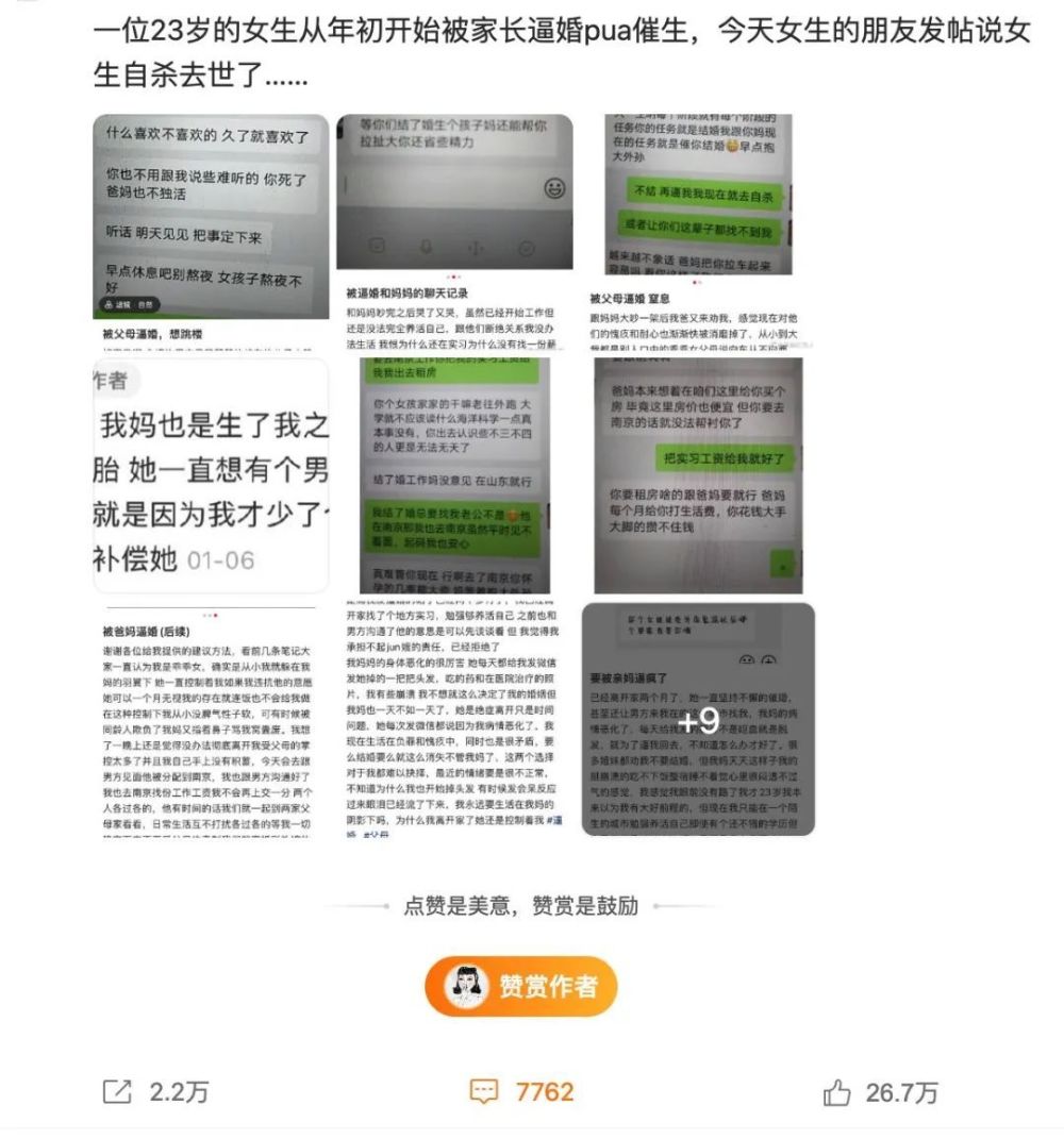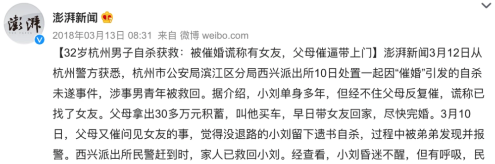 父母以死相逼催婚,子女不堪重负自杀的事情,年年重演。