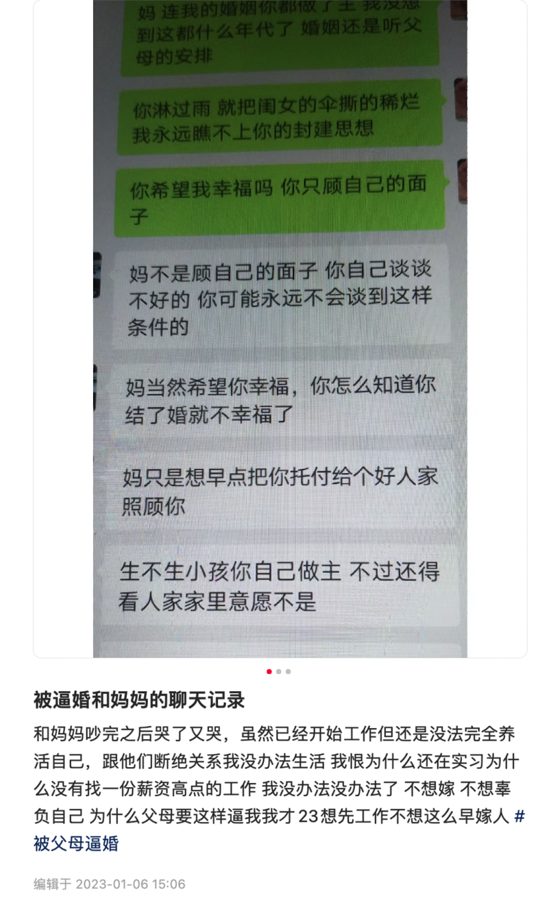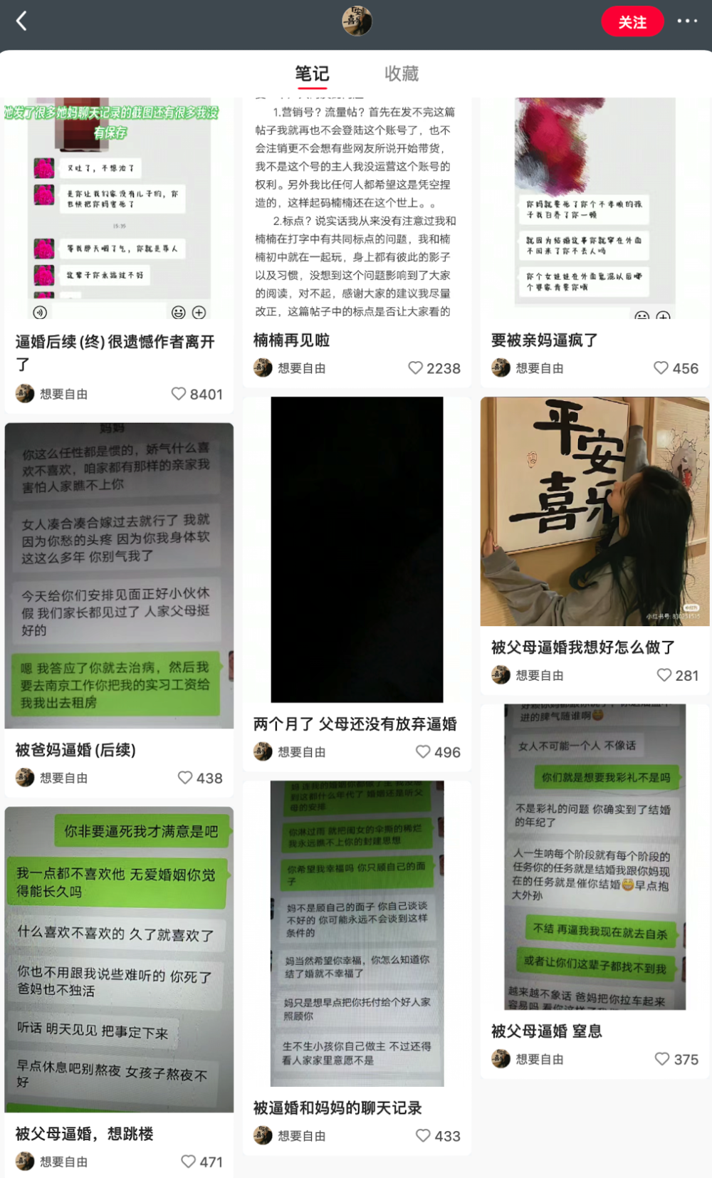 她最初的帖子发布在小红书,账号取名叫“想要自由”,全部内容只有催婚这件事,有人质疑事件的真实性。