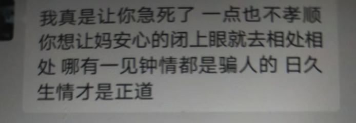 前期催婚的用词还相对温和,“想早点把你托付给个好人家”。