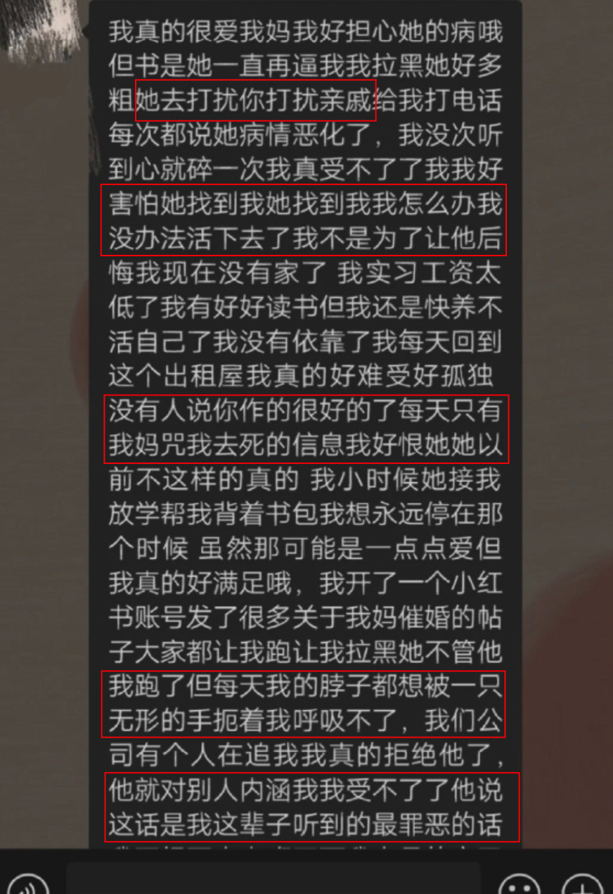 即使如此,哪怕已经离开家乡700公里,母亲的微信仍然不断撕扯她的情绪。