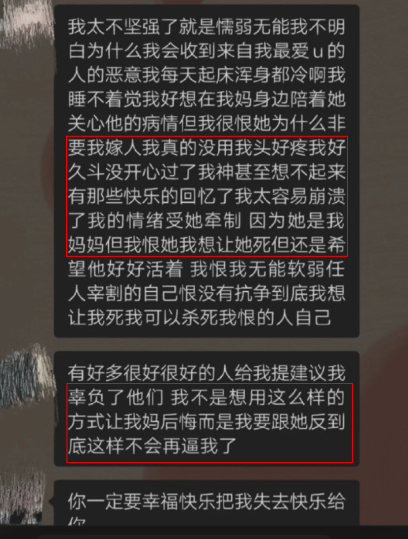在她给朋友的遗言中,能看出她是痛苦而矛盾的。