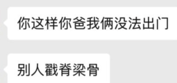 妈妈说,“你这样你爸和我俩没法出门,被别人戳脊梁骨。”