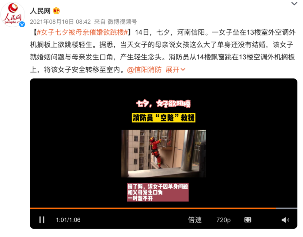 七夕情人节,河南信阳,一名女子被母亲催婚,她爬上13楼的空调外机搁板,想要跳楼。