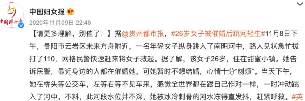 2020年,贵阳云岩,一名26岁的女子被家人催婚,跳河轻生。