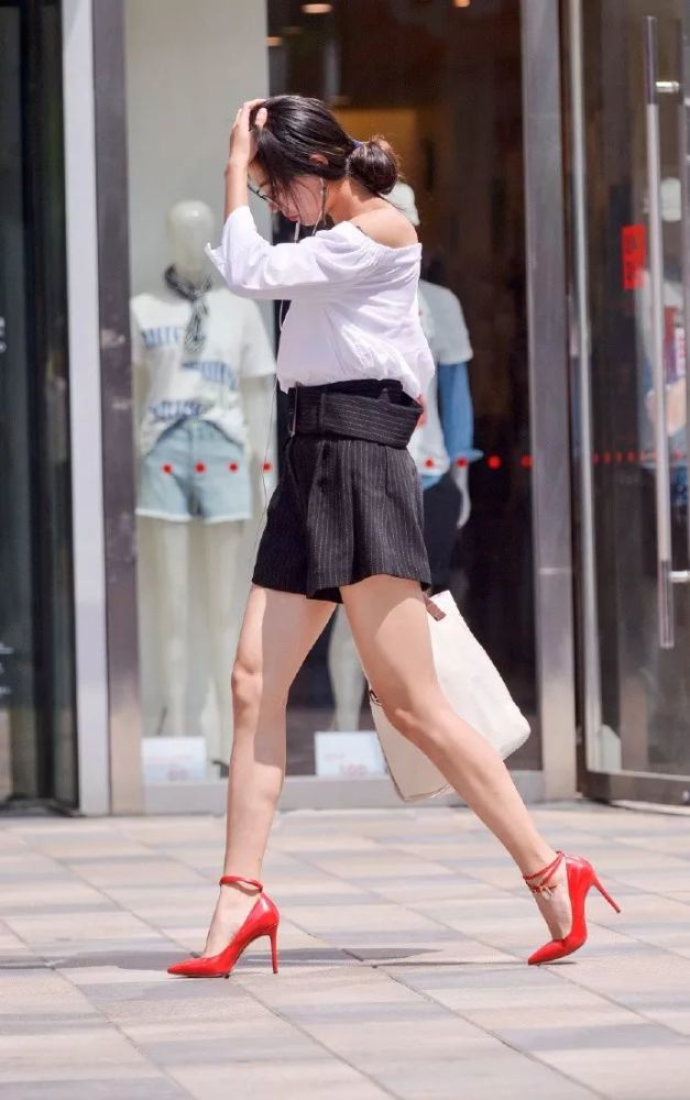 小姐姐出街的时候扎着一个气质的低马尾,让她看上去唯美之中又带着温柔的气息,身上穿着一件露肩的上衣,白色的色调带着清新与时尚,下半身搭配上一条黑色的短裤,高腰的版型让她的身材显得更加的高挑,一双红色的高跟鞋穿搭在脚上,走出一种靓丽的时尚。
