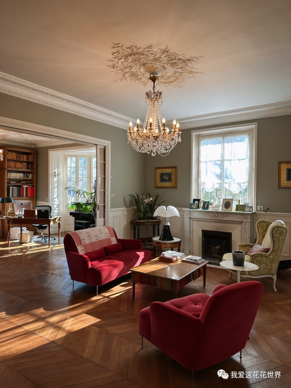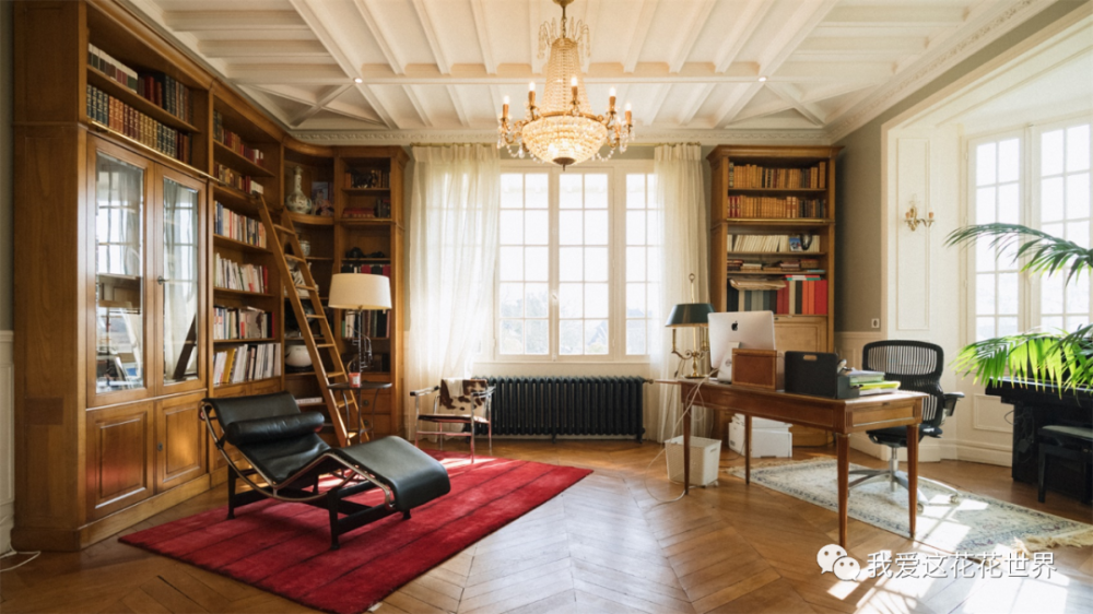 走过一扇门,紧邻着书房是几张沙发围起来的会客区,水晶灯、石膏线、壁炉,所有经典的法式元素汇集在一起,原汁原味的优雅,壁炉真的可以生起柴火来取暖。