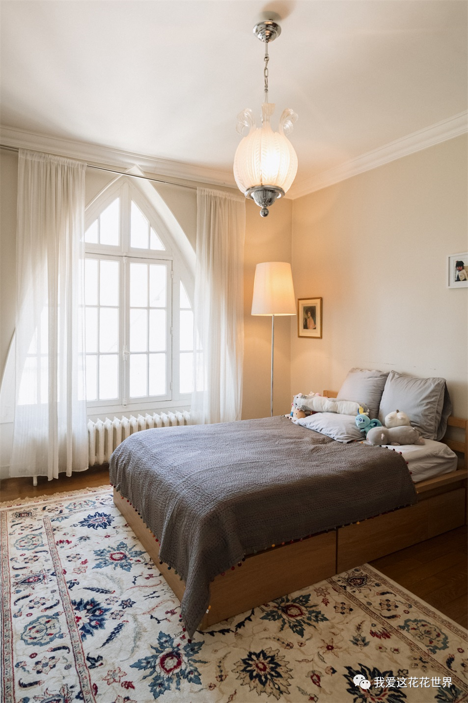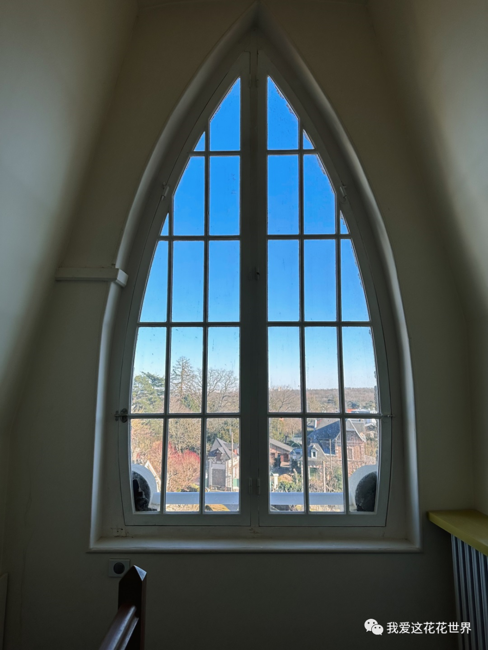 阁楼还得再往上两层,楼梯边上的弧形窗顺着尖顶往上,和教堂里的窗相似,圣洁、不可亵渎的美。