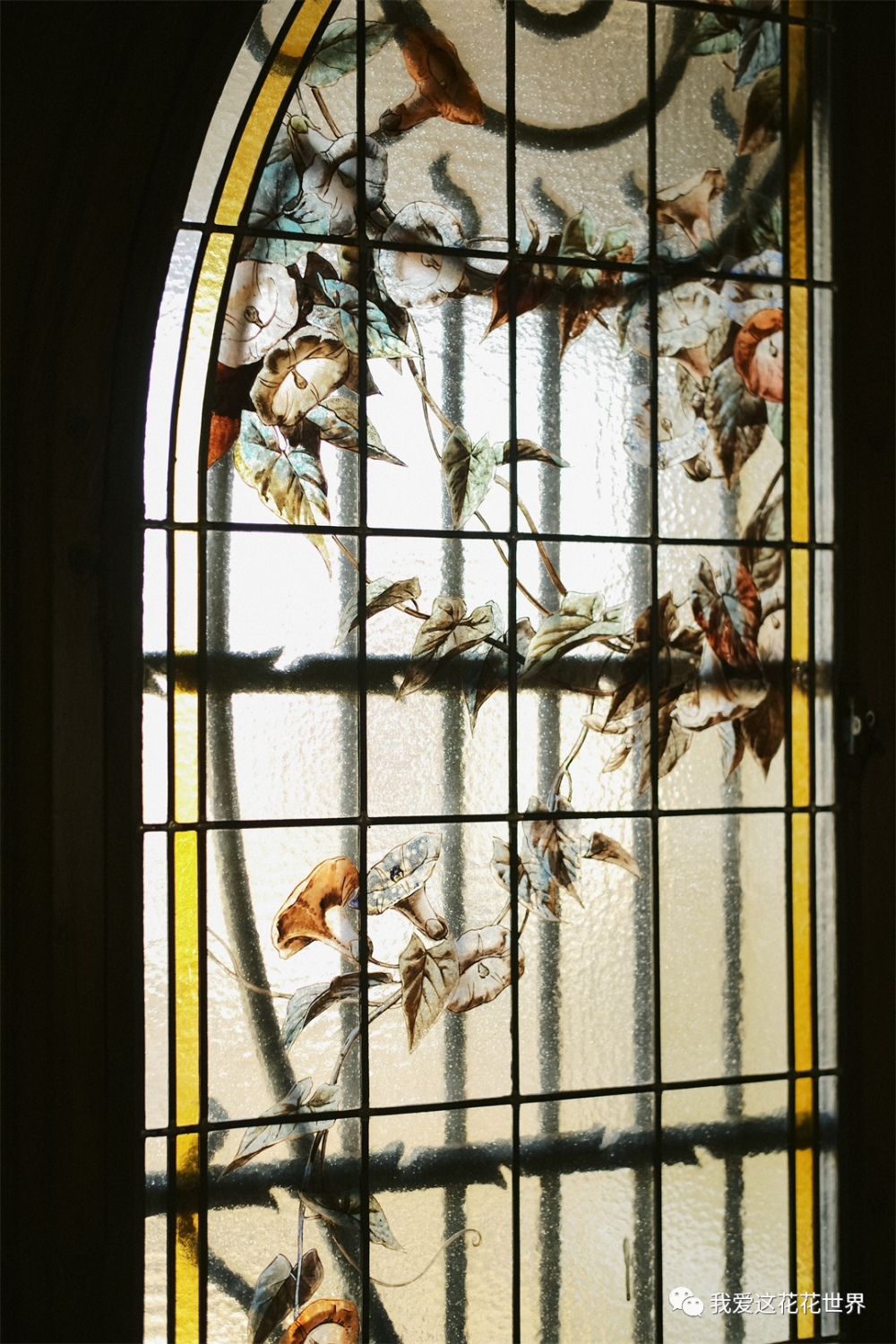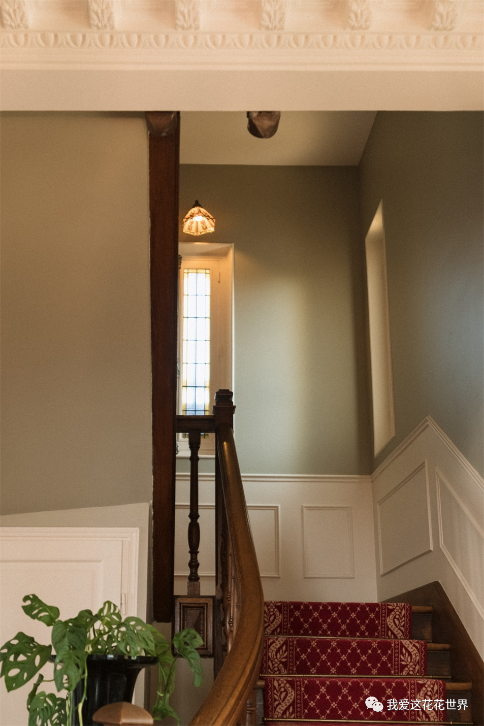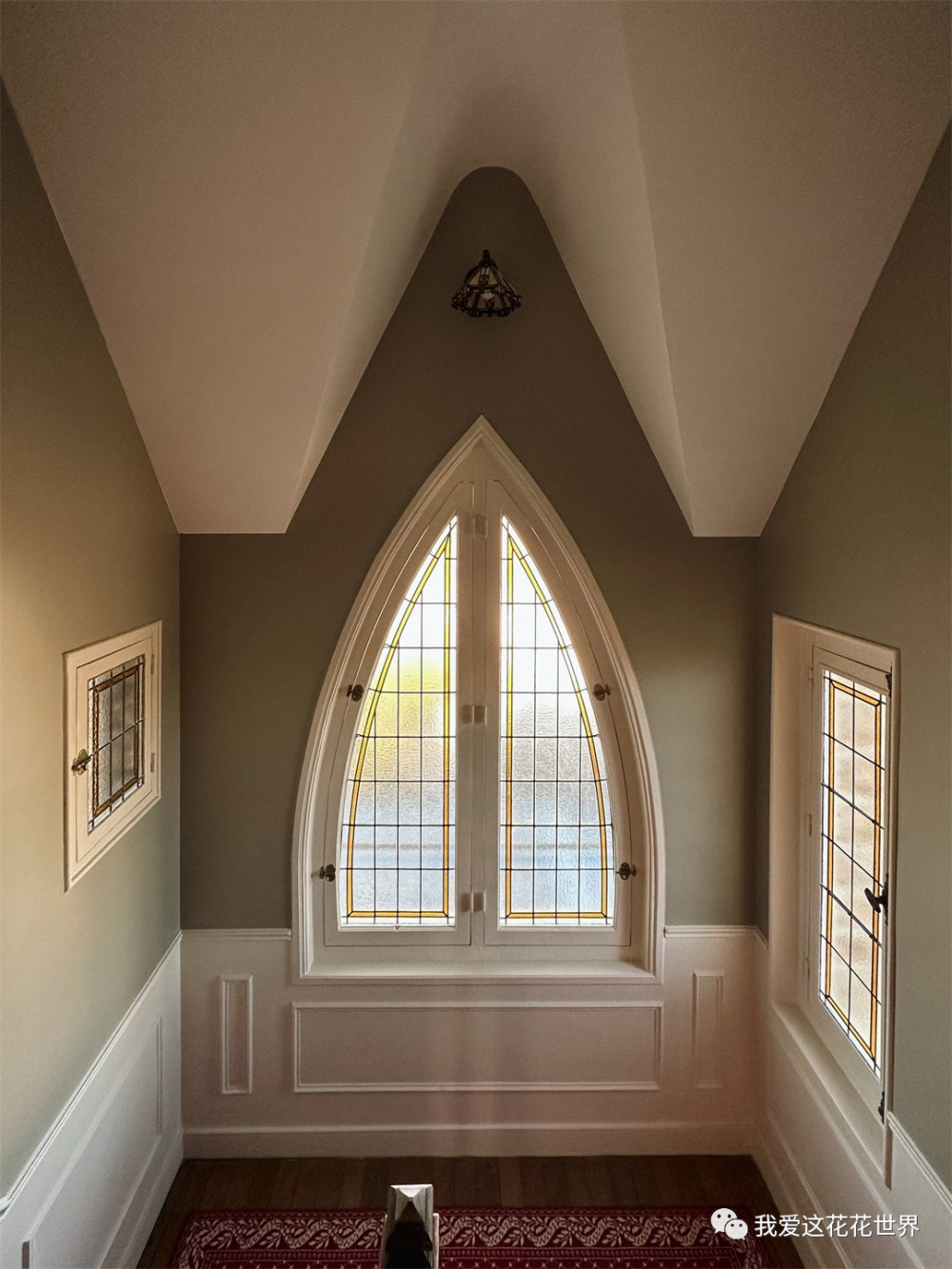 楼梯上的彩窗引人驻足,像框起了云朵的光影,彩虹落脚在墙面上,以为是幻觉。
