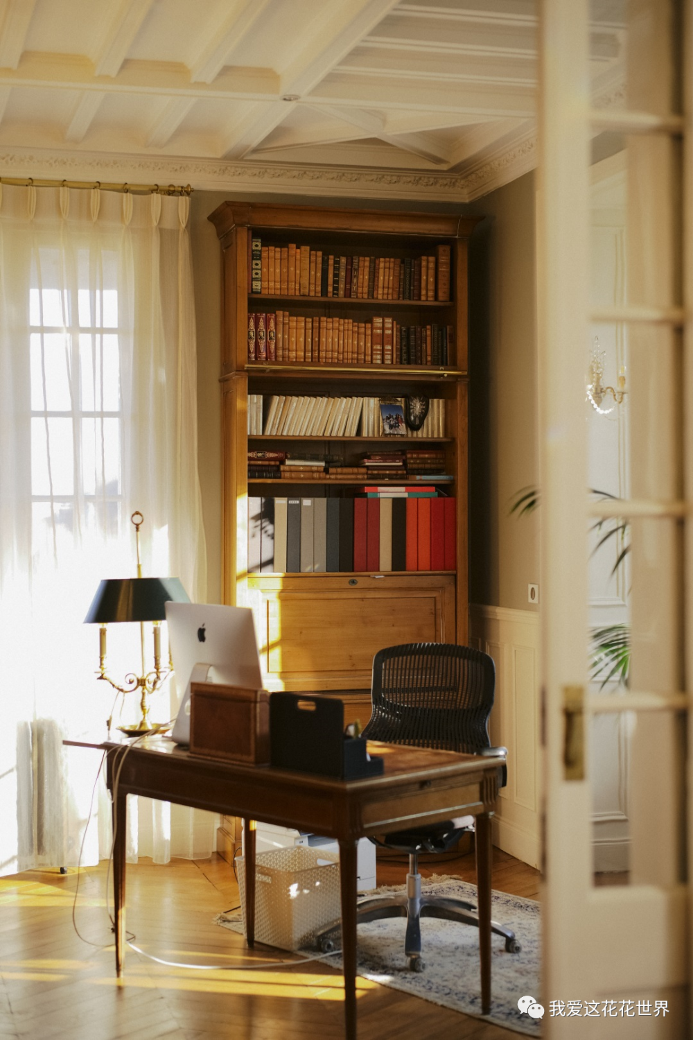 书墙是她十年前住进来时定制的,好神奇,它像百年前留下来似的,与这间书房近乎完美地融合在一起,被岁月打磨出木头的油润感。