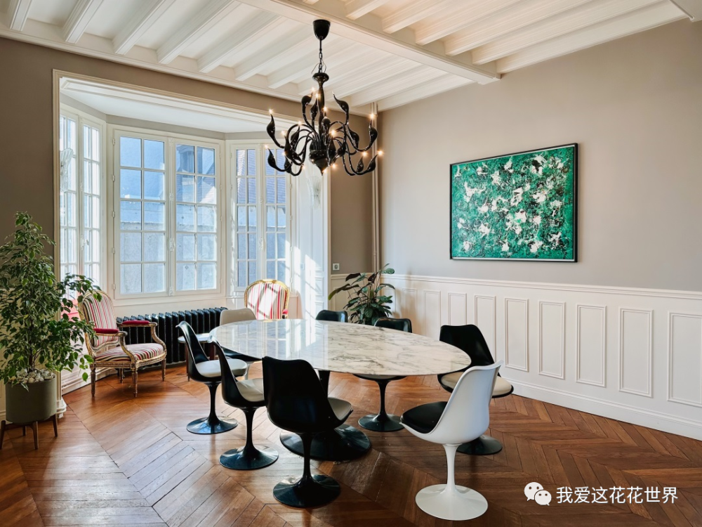 餐厅这儿有一张1920年设计的餐桌,黑白相间的郁金香椅围绕着它,用餐时该有多么浪漫。
