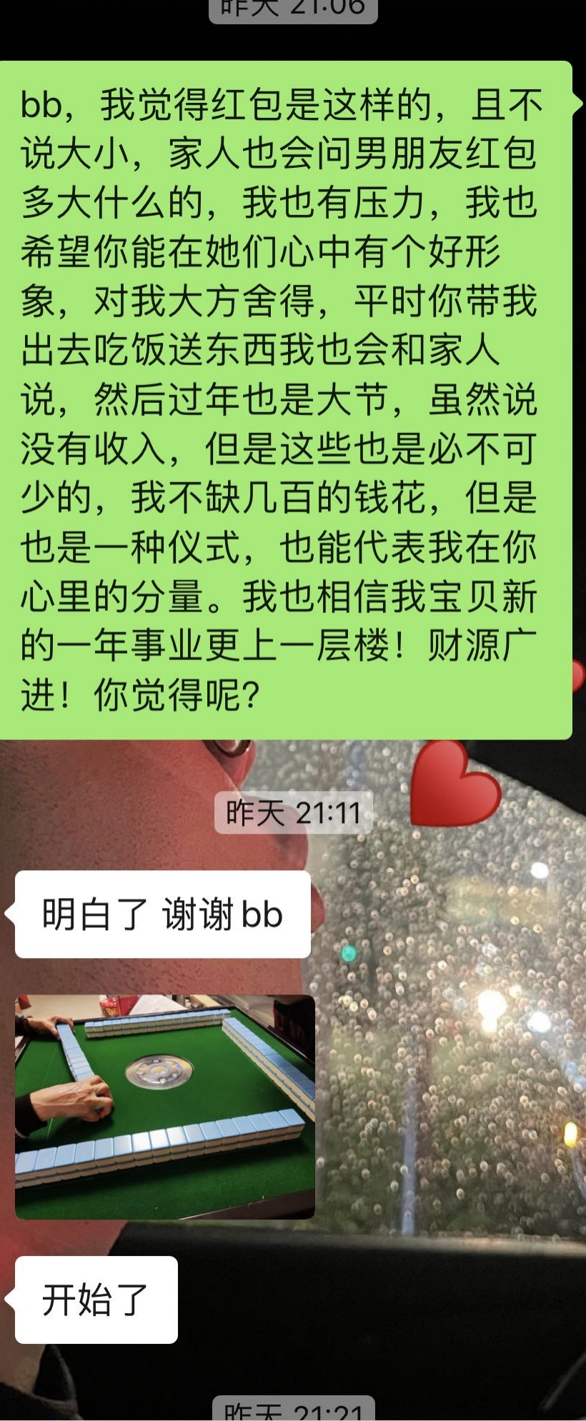 但如果你“嫌他不赚钱”,“希望男人要有男人的样子,花女人钱有点让我难为情”,以及像聊天记录里说的希望他“对我大方舍得”,“事业更上一层楼,财源广进”,那你最好考虑清楚要不要继续和他在一起,你对他的这些期待,怕是他一辈子都难以实现。
