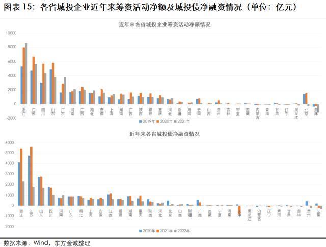 随着监管政策趋紧,城投公司信贷及债券融资均受到一定阻力,加之区域发展与财力的分化,城投公司间融资分化愈发明显,2022年各省城投债净融资多有下滑,西部及东北多个省份呈现净流出