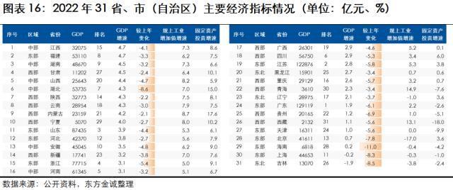 2022年各省经济增速下滑明显,中西部省份普遍跑赢全国水平,东部地区受疫情拖累增速放缓