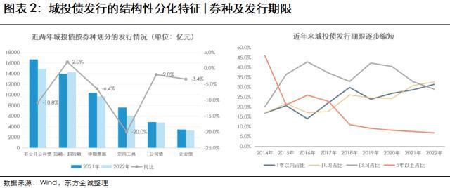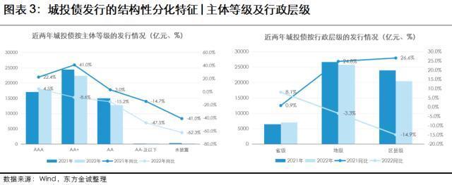 2022年城投债发行的结构性分化特征仍较为明显,私募债、PPN等券种发行降幅最大,发行期限进一步缩短;AA+主体发行增速大幅回落,区县级城投发行规模降幅最大;新发主体数量继续大幅减少,创十年来新低