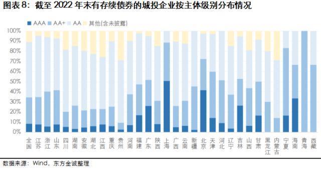 截至2022年末,资本市场有存续债券的城投企业共3000余家,分布于270余个地级市、近800个区县。其中AAA、AA+及AA主体占比分别为8.49%、26.07%和54.65%;区县级(含园区)城投占比近60%。