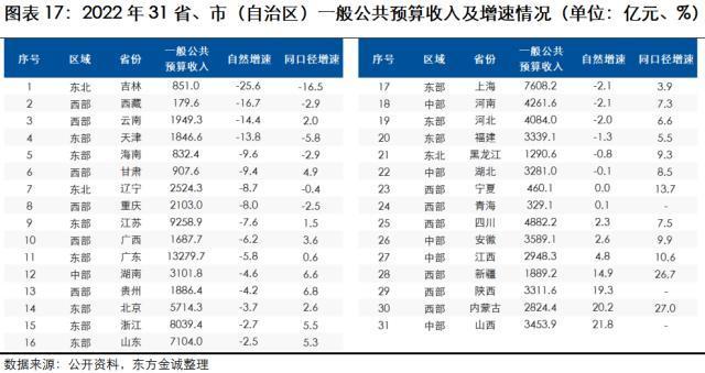随着疫情冲击全面消退,2023年各省主要经济财政指标将逐步回暖,但分化依然延续,部分产业基础薄弱、产业结构不佳、人口持续净流出、房地产及土地市场难有起色区域,财政收支仍面临较大压力。