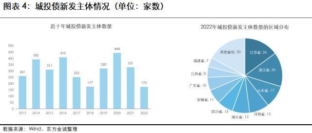 新发主体数量继续大幅减少,创十年来新低。2022年城投债新发主体数量进一步大幅减少至175家,与2018年基本持平,系近十年最低;新发主体数量前五省份为江苏、浙江、山东、河南和湖北,合计占比55.4%。