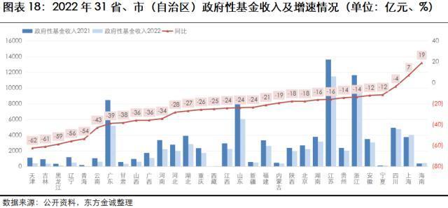 房地产业持续低迷、土地市场景气度下降的背景下,2022年全国政府性基金收入实现7.79万亿,同比下降20.6%。各省来看,除海南同比增长19%、上海同比增长7%外,其余省级行政区政府性基金收入均有不同程度下滑,东北及西部地区总体下降较为明显。天津、吉林、黑龙江、辽宁和青海政府性基金收入下滑超五成。