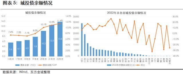 2022年末,城投债余额继续升高,达13.8万亿,较上年末增长10.5%,增速有所放缓,占GDP比重进一步提升至11.4%。从各省来看,由于发行缩量、债券集中到期,东北三省及贵州、云南、甘肃、青海、内蒙等省债券余额同比均有所下降,呈现融资净流出,其中甘肃、青海和内蒙降幅均在20%以上。