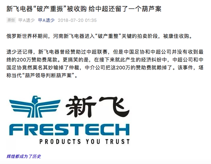 2018年春节后中央巡视组巡视国家体育总局期间,部分中国足协员工递交了检举材料。材料里,就有提及当年新飞电器中超赞助款中200万尾款莫名其妙被赖掉。