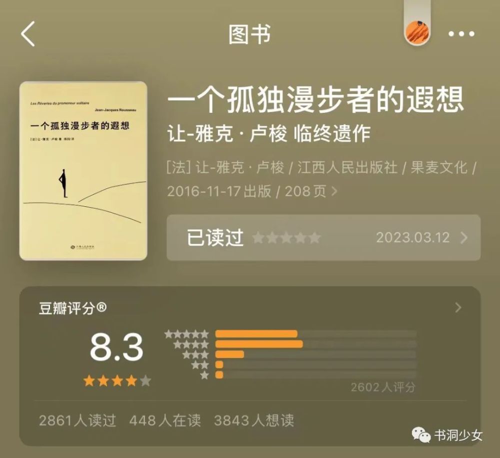 卢梭老年对于人生的思索总结。关于真相关于谎言,关于人生逆境和顺境,关于人生幸福,还有一点点卢梭和华伦夫人甜美又转瞬即逝的爱情。