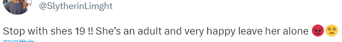 “别在说‘她只有19岁’了!!她是个成年人,现在非常开心,让她自在地过自己的生活吧。”