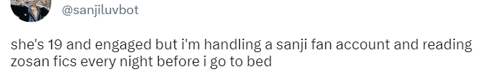 “她19岁订婚,而我还在给《海贼王》里的山治开粉丝账号,每晚还要伴着索香同人文入睡。”