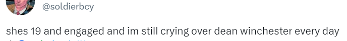 “她19岁都订婚了,而我还在日夜为《邪恶力量》里的Dean Winchester流泪。”