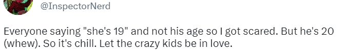 “所有人都在说‘她只有19岁’,都不说男方的年龄,搞得我很害怕。但他也只有20岁嘛(松了口气)。大家都冷静点吧,让这对疯狂的小孩自由地相爱。”