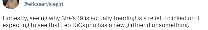 “说实话,看到‘她只有19岁’到底为什么上热搜之后我真是松了一口气。刚看到的时候还以为是小李子又有新女朋友了呢。”