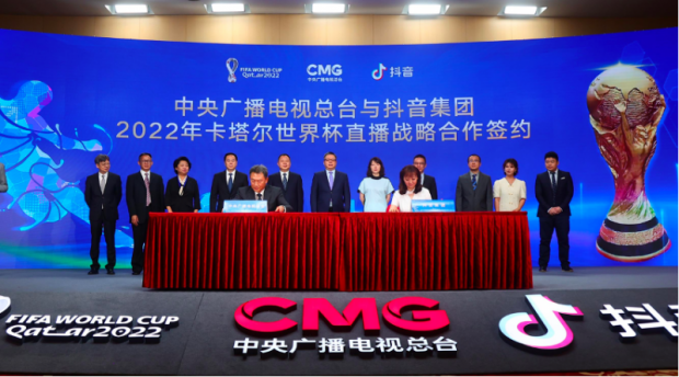 5个月前,中央广播电视总台与抖音集团联合举办云发布活动,宣布抖音集团成为2022年卡塔尔世界杯持权转播商、中央广播电视总台直播战略合作伙伴。
