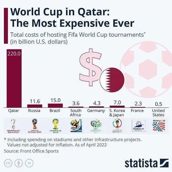 人口仅280万的卡塔尔,为这次世界杯投入了约2200亿美元,顺利登顶“史上最贵世界杯”。作为对比,2018年俄罗斯世界杯投入116亿美元,2014年巴西世界杯投入150亿美元。