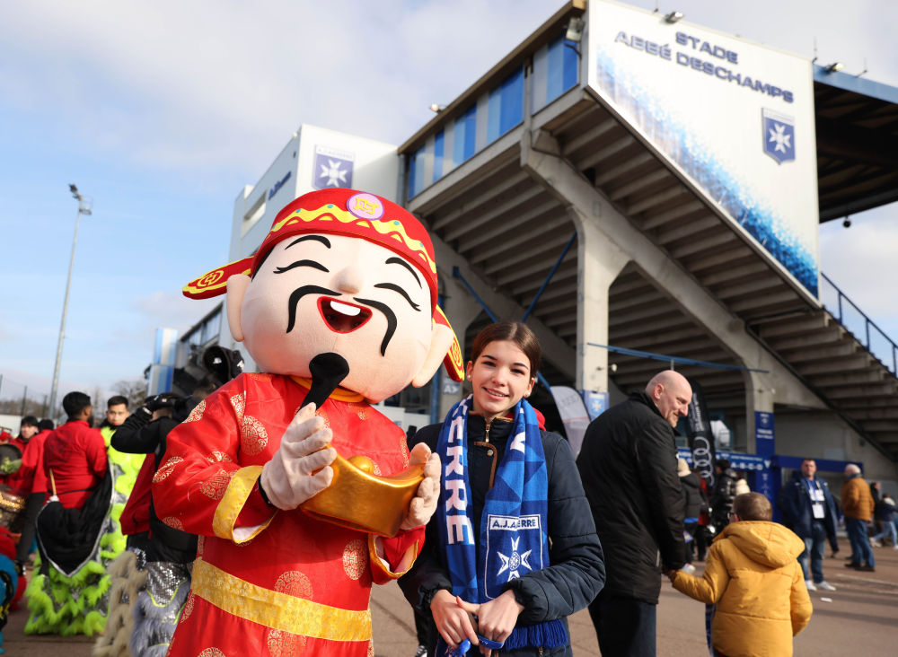 2023年1月29日,法甲举办“中国日”庆祝春节,一名球迷与装扮成“财神”造型的工作人员合影留念。