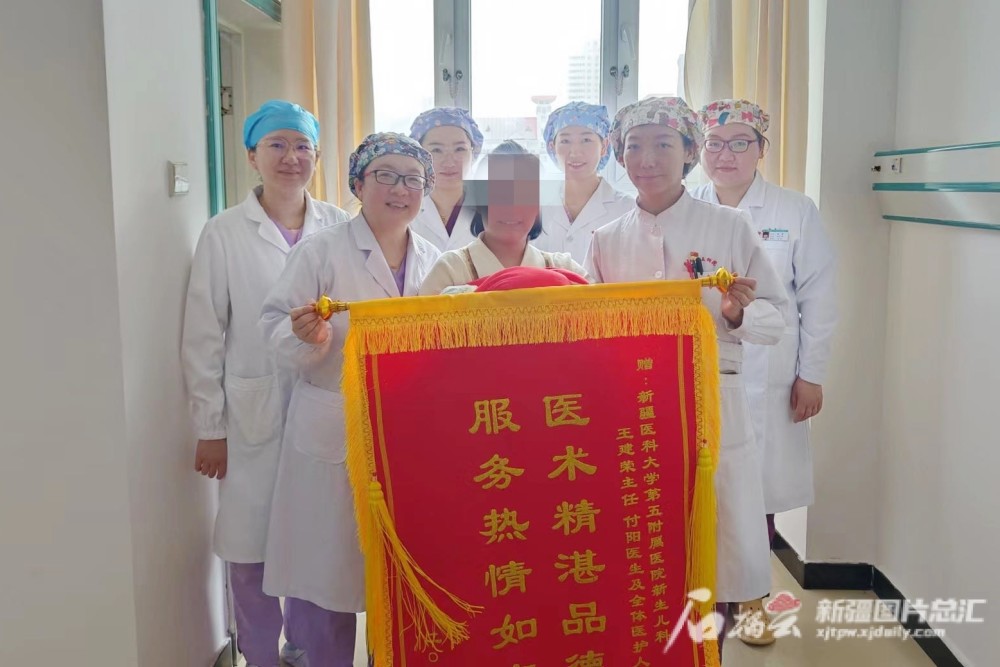 4月10日,新疆医科大学第五附属医院新生儿科,临出院时,豆豆父母为医护团队送上锦旗。魏美娟 摄