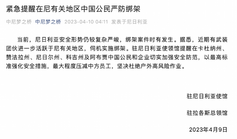 此前,3月23日,中国驻尼日利亚使馆也发布提醒: