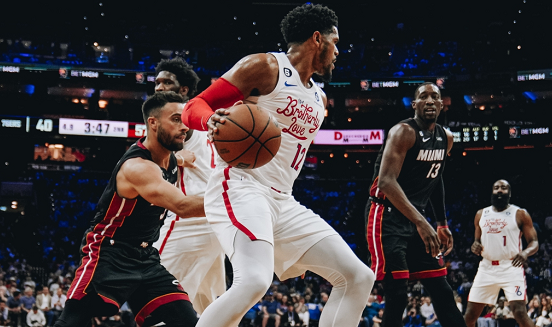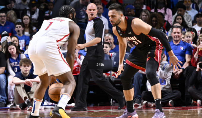 第三节,哈登接到恩比德传球,命中三分球,随后76人打出一波11-0,缩小分差的同时打停热火。这一节哈登打得时间不少很长,76人落后18分。